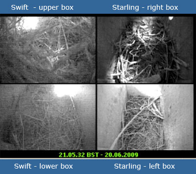 It has been an interesting, if somewhat frustrating nesting season for the Great Tits, with the rather disappointing first brood losses, but this group of fledglings appeared to be in much better condition than the first brood so I'm more optimistic that at least a couple of them should make it through to next year. Up in the other boxes it's been a rather quiet day after a couple of hours of Sparrow activity after dawn and a visit into Starling box R by a juvenile Starling at around 8.15am. Again the House Martin nests remain silent. Following on from the activity I'm seeing in the Swift and Starling boxes have I have decided to switch the webcam to cover just those boxes for the moment: