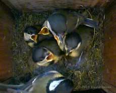 Go to the last entry on this page .......,,,.. Go to previous entry16 June - We have been away for the last three weeks, mostly in Cornwall after spending a few days in South Wales on a family visit. Now that we are home again, the diary should get back to normal over the next few days. Unfortunately, while everything was working when we left, it seems that the laptop running the webcam must have crashed soon afterwards and so it hasn't been possible for you to follow progress in the nestboxes, particularly the Great Tits. However, I have been recording activity in the nest boxes and I hope to be able to add a summary soon. The Great Tits' second clutch seems to have done well and tonight there are five healthy looking chicks and their mum in the box. It looks as though the chicks are just about ready to fledge. The Starling boxes haven't been used since the first brood, and the House Martin nests remain unused, with not even a Blue Tit roosting tonight. The Swift boxes offer a bit of a mystery. The CD of Swift calls has been playing every day during our absence, but tonight the two boxes are unoccupied. However, a lot of extra straw has been brought into the upper box, and the lower box also shows signs of being visited. A quick check back through the time-lapse recording reveals that there have been no visits by Swifts so far, and it is House Sparrows that are responsible for the changes seen in the boxes. A Sparrow has also been in the left-hand Starling box. There were at least ten Swifts flying low over us this evening so despite the presence of Sparrows, I will continue to play Swifts calls until the Swifts finally depart.