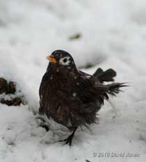 The scruffy male Blackbird was seen just once this morning, but at least two other males came to feed, one completely black and the second with just a couple of flecks of white. As usual the Song Thrush had to run the gauntlet of these birds whenever it came to feed. Also, for the first time during this cold spell a female Blackbird visited several times.