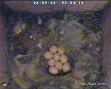 During the rest of the morning she returned just once, at 11.32am and stayed for about a minute. However, at 2.20pm she entered the box and settled on the eggs, staying for an hour. When she left at 3.20pm she left the eggs uncovered, giving me my first chance of the day to confirm the presence of the eight eggs.