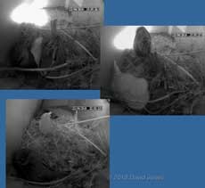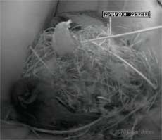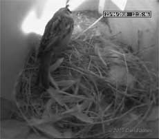 Looking at tonight's webcam image it's interesting to see how the far end of the box as been cleared of nest materials, and it looks as though the area just inside the entrance has been completely cleared of all debris. You get a good idea of how built up the nest now is, with quite a step up onto it from the wooden floor.