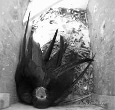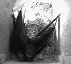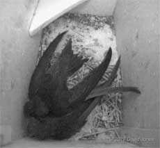 26 July - It was a grey day, and although the cloud base remained quite high there was far less Swift activity compared with yesterday. In SW(LE) the day began with White Spot leaving the box at 5.24am. She didn't appear again until 1.32pm when she returned and stayed until 1.53pm. After that the chick visited the exit quite frequently, but I was surprised how little time was spent exercising its wings.