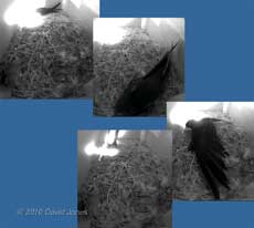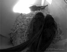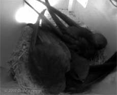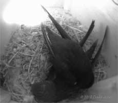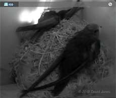 The remaining pair have settled down for the night, but I would expect the second chick (hatched 15 June) to fledge tomorrow. White Spot is on the left in this image. In addition to the white marks distinguishing her you can also seen how her wing feathers do not have the fresh lighter edges of the those on the chick.