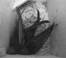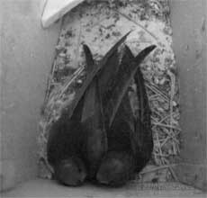 Back in their own boxes the Sparrows continue their nesting. This morning I found pieces of a Sparrow egg directly below the Sparrow Terrace situated on the west side of our house.