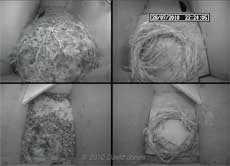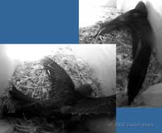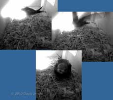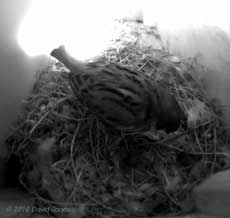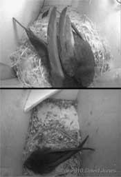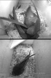 In SW(LE) a technical fault meant a poor webcam image overnight. Fortunately it turned out to be a bad connection behind a multiplexer and was easily solved. By 6.20am the male had already left the box, and with the two chicks and mum (on the left) still remaining huddled together, this yawn by a chick summed up my early morning feelings!