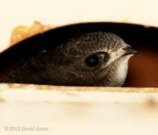 Heading away from the Swifts for a moment, the absence of House Martins again has been a disappointment. I have only caught sight of a single Martin a handful of times during the nesting season. However, when I walked up back up our road this evening I heard something that made me look up. To my surprise there were two small white faces peering out from a Martin's nest! How have I missed it up to now? Anyway, this has reminded me that even when the Swifts do finally depart I will need to keep monitoring the Martin boxes even though there has been no activity at all in them over the last couple of months. In the past we have been surprised by a whole family of Martins arriving to use the nests as a roost before the adults went on to produce a late second brood. As I write this at 8pm I see that the Swifts in SW(UP) are looking out once more. It is fine, and quite bright outside (for this time in the evening). One of the pair actually seems to be nibbling at the straw of the nest, perhaps cleaning up in the way that the adults do.