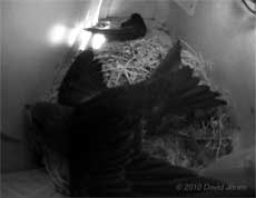 Despite heading for the exit several times, the chick kept on returning to its parent until after 9.50pm. Then, there was a stretch of wings and soon afterwards it headed for the exit again.