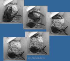 The other active box has a side-facing entrance, and in this case I saw both parents taking in very small food items, and staying in the box for some time on each visit. This picture shows the male having to move aside as his partner leaves. Perhaps the egg came from this nest.