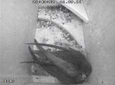 There was a total of visits during the afternoon. The evening saw six more returns, with the final arrivals taking place at 8.09/8.10pm, making an overall total of 14 returns today. While they spent prolonged periods in the nest cup, there were periods when the chicks looked quite agitated today, moving between the nest and the exit, and there was more wing stretching taking place, as well as another visit to the ledge. After it seemed that the Swifts had settled down for the night one of the chicks had another vigorous exercise session at just before 9pm, over the heads of the rest of the family.