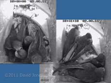 Of course, what I haven't mentioned is that not only has one of the chicks fledged, but tonight only one of the parents is present in the box. Here the parent (its wings show up a lighter grey in the infra-red light) is preening its remaining offspring.