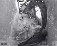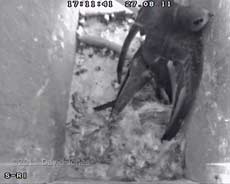 1 September - The first chick fledges It was just 8C at 7am, but with the cloud cover that plagued us in August all but gone, apart from 'cotton-wool' clouds) the temperature rose to over 21C by the early afternoon (with the chicks still on the inside and looking out!). It remained warm all afternoon before cooling to around 16C by 8pm. The chilly start didn't put the adults off departing at 7.01am, but they didn't return all morning, the first feed of the day not taking place until 1.01pm, with a second visit at 2.22pm. There was just one more afternoon visit, at 4.22pm.