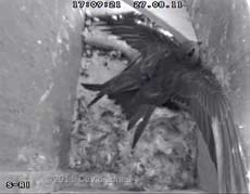 In the afternoon the parents reappeared, one at 2.55pm, then at 4.25pm and then the pair arrived at 5.42/5.45pm. And in the evening they returned six times, including when they retired for the night at 8.07pm, making a total of 10 returns today. As for the chicks, the day followed the now familiar routine of moving between resting and looking out, with the occasional exercise session, with nothing out of the ordinary to report on, although I don't either bird climbed onto the ledge today!