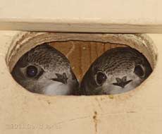 The chicks seemed to spent as much time looking out as they did on the nest today, and on a number of occasions they were side by side at the exit for quite long periods. There were several vigorous wing exercise sessions (standing in our driveway I could hear the flapping during a couple of these), and at least one of them climbed onto the ledge, but at the end of the day they welcomed their parents 'home' and settled down to wait for the start of September!