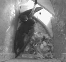 Yesterday was largely uneventful in the Swift boxes (some details will be added eventually!), today the occupants of SW-ri have produced their second egg, and it looks as though incubation is now under way. It seems that late broods like this are not so unusual in UK Swifts, so it looks as though the diary will now continue until the end of August!