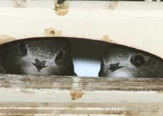 16 July - The second chick in SW-up is still with us, although it must have been pretty hungry by this evening as its parents have returned just once during the day, when they stayed for a couple of hours during the worst of today's rain. The chick has spent much of the rest of the day looking out, and although it seemed to get very close to leaving a few times it always ended up back on the nest. One of the parents returned for the night at 9.29pm with the other arriving at 9.36pm. Over the next quarter of an hour or so, and while the parents are occupied with mutual preening around their necks, the youngster was perched on the brink of the exit.... The weather wasn't actually as bad as we had expected. A dull start with drizzle gave way to periods of heavy rain. These eased off as the afternoon progressed, finally giving way to a bright evening. Before the heavy rain started there must have been thirty or more Swifts overhead, the most we've seen for a couple of weeks. Today's weather had an effect on the adults in both the other boxes. In SW-le the parents have returned with food just nine times today (female 7; male 2), and the chicks saw neither parent between 8.59am and 2.15pm (the wettest period of the day). Tonight the returned briefly at 9.35 (male)/9.37pm (female) but did not feed the chicks before they left together again just a minute later. They finally returned for the night at 9.46pm. In SW-ri there were just five change-overs all day, and the eggs were left unattended between 6.54pm and 7.33pm after one bird had been left unrelieved since 2.53pm. After that gap there was just one change-over during the evening before the second bird returned for the night at 9.27pm.