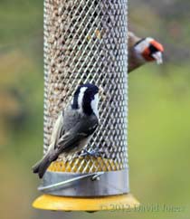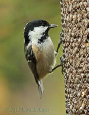 A follow-up from yesterday -today the Coal Tit didn't make its first appearance until the late morning when there were Goldfinches here. This forced the Coal Tit to come around to the house side of the feeder during its first visit, allowing me to get this picture to show the white stripe on the back of its head.