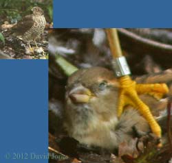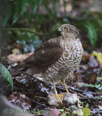 Some of the resident Sparrows were at their feeder when the hawk surprised them, and although the feeder is barely a foot from the Cotoneaster shrub the slowest Sparrow had no chance. The Sparrowhawk dropped to the ground and waited as the Sparrow struggled in vain, giving me a chance to get to my camera and take a couple of 'insurance shots' through the half closed blinds. At the top of the picture you can see banding caused by the blinds and their reflections in the double glazing. I tried to alter the slat openings but although I moved very slowly the hawk saw me and headed off to the bottom of the garden to eat its meal in privacy! I don't recall seeing a ringed Sparrowhawk in the garden before. Unfortunately there didn't appear to be any markings on the ring that were visible from my point of view.