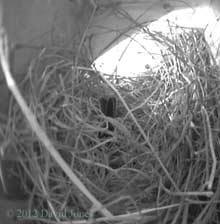 29 March - A follow-up to last night's confusion. During the night the pair didn't move from the positions seen in that last image, but at 6.45am the female (nearest the camera) woke up and headed out of the box, her partner following two minutes later. At 6.51am the female made a silent entry into SW(le), heading straight into the nest cup. In contrast, when the male entered some three minutes later the whole world could have heard his chirping! That the pair left the eggs unattended overnight is a surprise to me, and I'll be interested to see if that happens again tonight. I would expect that once egg-laying is completed the female will remain in the nest. As I write this at 9.15am I have just seen the male bringing in a beakful of soft nesting material, both birds having been busy building up the nest cup over the last half hour or so - the female has brought more in.