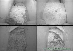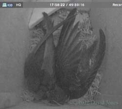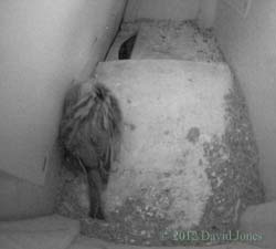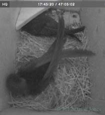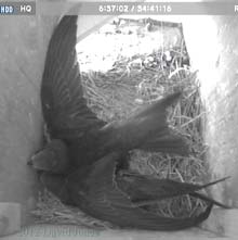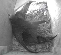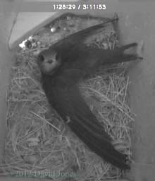 nesting takes place. ![]() Also on the front way is this trio of artificial House Martin nests. Not used since a complete brood died of starvation during bad weather in 2007. However, the boxes are equipped with cameras and monitoring continues each year. ___________________________ 24 July - At 3.40pm on a hot day the chicks are still with us. ![]() They have been looking out a lot more today, although usually keeping back from the exit itself. They continue to be fed although I haven't seen more than one adult in the box. ![]() In contrast to that, while there was only the one resident in SW(ri) last night, at 1pm this afternoon there were two birds in there, staying for quite a while. I mentioned at the beginning that it is a hot day. As I write this (3.45pm) I have a thermometer sensor perched at the top of a long bamboo so that it is about 50cm below the boxes. This is registering 30C. Down at head height the temperature is 31C. The slight difference in temperature may be accounted for by just a hint of a breeze that is blowing from east to west down the driveway. During most of the day these boxes, on the north side of the house, are in full shade, although as we head into the evening during the summer the western end of SW(ri) will receive direct sunlight. Perhaps I should consider attaching a reflective surface to that end panel before next year. Even when the boxes are in full shade, on sunny days like today I expect that some heat may be reflected from the pebble-dashed wall of my neighbour's house which is in full sunshine - I placed the sensor against that wall and got a reading of 36.8C. While I was taking these temperatures there was an adult in SW(ri) and neither it nor the chicks next door appear to be suffering in any way. The boxes are ventilated in that as well as the entrance itself there is a gap of about 10mm along the top of the front wall, tapering to nothing under the ends of the sloping roof. ![]() During the day wing and tail exercises continued in SW(le), but there was no sign of the heightened excitement that seems to occur before fledging, ![]() until around 9pm when I began to think that at least one departure might be imminent. At the time there were at least a dozen Swifts flying about, with groups of up to five making screaming passes through our driveway, and this seemed to trigger an energetic spell in the box. ![]() However, at the end of the day we still had the two chicks, together with one parent in SW(le), but SW(ri) is empty, despite there having been two Swifts in there this afternoon. And notice the Sparrow in SW(up). This has now become a regular rooster in that spot. 25 July - On what is likely to be an even hotter day the chicks are still with us at 9.30am. ![]() Not only that, but a Swift has been in SW(ri) since 6.45am. I'd be surprised if at least one of the chicks doesn't fledge today.... ![]() While in SW(le) the chicks get the occasional feed, look out and otherwise take things easy, in SW(ri) the adult pair have spent at least three hours in the box during the morning, and just after 2pm this Swift brought in what appears to be fine straw. I wonder if the rather lethargic behaviour of the chicks today is related to the temperature. Once again I have the thermometer in place and this indicates that it is the hottest day of the year so far. At 2.15pm it registered 32C just below the boxes and 32.7C at head height! At 4pm it exceeded 33C just below the boxes, although the temperature dropped by a degree or so whenever the breeze picked up. ![]() Despite my prediction the chicks are still here tonight, along with one of their parents - and SW(ri) is empty again. And our Sparrow rooster is in SW(up). 26 July - With fledging having been due 20-22 July there can be no doubt now that the long period of bad weather that we experienced slowed down progress for the Swift chicks. ![]() At 12.45pm they are still with us, gazing towards the exit from a safe distance, as if leaving room for mum (or dad?) to arrive with food. There has been some exercising but no great enthusiasm to check out the world outside, despite at least one occasion when a dozen screaming Swifts flew past the box. ![]() During the morning there was little activity in SW(ri), with a single Swift spending just half an hour in there from around 8.30am until just after 9am. This turned out to be the only visit to that box all day. In SW(le) for much of the afternoon and evening the ledge above the entrance was occupied by either one or both chicks. ![]() Between noon and 9.20pm they were visited by a parent just three times, ![]() and tonight they are still with us, but with neither parent present. Fledging cannot be more than a day away now. Today was definitely a bit cooler, with the temperature around mid-day just below the box being 28C in a steady light breeze. By 3pm it was up to just over 31C but got no higher. The BBC news this morning included a report about the effect the wet weather in May and June has had on Swift breeding this year, with the RSPB describing the situation as disastrous, with many Swifts returning to Africa early. With Swift numbers already declining by some 30% since the mid-1990's this year's high failure rate could affect the population for years to come. Also, an article on the same topic appeared on the Guardian website While I've been disappointed with having just the one breeding pair on my house, at least I can be certain that there is at least one more breeding pair in one of the boxes that I put up for my neighbours. Hopefully 'my' non-breeding pair will return to better weather next year and produce offspring. ![]() Just to end today's entry - unusually, the Sparrow that roosts in SW(up) has chosen to settle away from the entrance tonight - I wonder why? 27 July - The first chick fledges - ![]() On a morning when high cloud is protecting the boxes from the rising sun, and in a very 'quiet' exit, the first of the chicks headed out at 5.27am. 