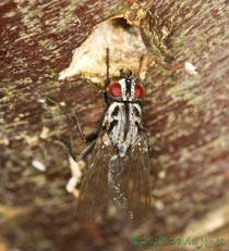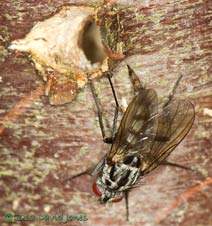 As the fly moved about the area surrounding the entrance it repeatedly extended its abdomen and probed irregularities in the bark. I can only assume that it was prospecting for egg-laying sites. During the time that I watched, this was only happening within a couple of centimetres of the entrance, leaving me wondering if there was some sort of link between action and location.