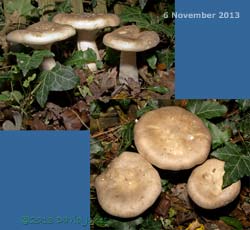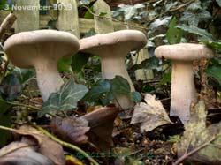 At the beginning of the month I spotted this trio of quite substantial fungal fruiting bodies in the shade of the Cotoneaster. On the 3rd the largest, in the middle of the group, measured around 9cm across the cap.