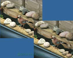 In the previous entry I mentioned that a Jay was taking acorns from the garden. It was here again today, returning numerous times to take acorns from the same planter. By today the acorns had germinated and were split, which was perhaps not a bad thing as on several visits the Jay swallowed the acorn before leaving.