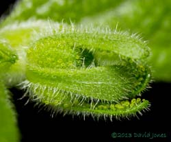 If, as it's very likely that these flowers are insect pollinated, the next mystery concerns the sticky globules. I realised that they are stick when I noticed that bits of dust readily adhered to them, but why are they present around the flower while the rest of the plant, stems and leaves, has a light covering of short, fine hairs? Could they emit some sort of scent to attract insects, or are they there to protect the flowers (the flower stalk itself is no more hairy than the rest of the plant). There is a third option that occurs to me, that this is an insectivorous plant and they will entrap insects that visit the flowers.