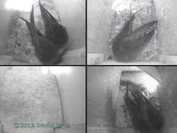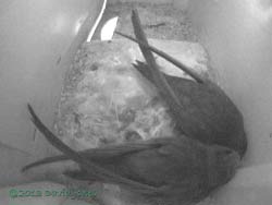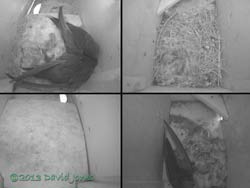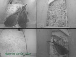 After the pair left the box around 8.20am there were two visits during the day. The first, at 10.55am, was to bring in some feathers, while the second, at 12.33pm was to deliver what looks like fine straw. That second delivery was a bit of a surprise as there was hardly a breeze all day, and not even the clouds appeared to be moving very quickly.