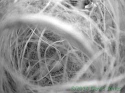 The Sparrows have been very busy today. The bottom of the box is now completely covered and some interesting materials have been brought in, making me wish that I had a colour camera installed in the box!