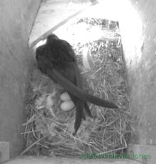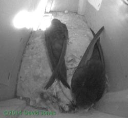 It will be interesting to see what the Swift pair make of what has happened. Will they try to eject the eggs once more, or will they go on and incubate them (even though the first egg is likely to fail)?