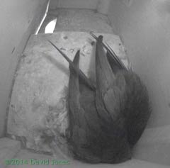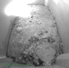 Box SW(up) has been problematic again this morning. The first egg was still in place and somewhere around 11am a second egg was laid. The pair were huddled over the nest cup, keeping very close together, but it was soon evident that the egg was not under either bird, but at the side of the nest. A couple of minutes later, while the pair continued to move about in the nest cup, the egg could be seen half way across the box, finally ending up near the far right corner before one bird left the box.