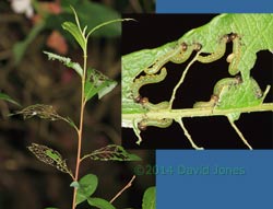 Growing in the damp soil at the side of the big pond there is a young Willow which has grown from seed and which is now around 7ft tall. I suspect that it is an Almond Willow (Salix triandra) although I do need to take more time to check on that. It has yet to flower - perhaps next year? Anyway, what caught my eye this afternoon were a couple of short branches bearing skeletonized leaves. A closer look revealed that tiny sawfly larvae were at work.