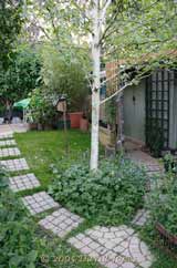 Once past the Rowan, the path divides. The left-hand fork heads up to the West Wing, while going to the right takes you to the (metal) garden shed and to the Blue Tit/Great Tit nestbox. In the fork is our Himalayan Birch tree. Bought as a bargain priced sickly-looking specimen from our local garden centre some years ago, it has become a healthy, attractive tree that provides a home for Orange Ladybirds every year.
