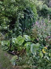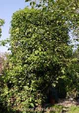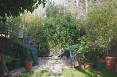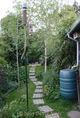 click here. Once past the ponds the path takes you between a young Rowan tree and a large bamboo plant with an area with a mixture of wild and cultivated plants in front of my workshop shed. The Rowan was planted to provide an extra source of berries for winter feeding by the birds. The tall peanut feeder was erected to attract the local Woodpeckers. It succeeded during late 2004 but they haven't become regulars as I hoped. The water butt overflow is linked to the big pond (see pond link above).