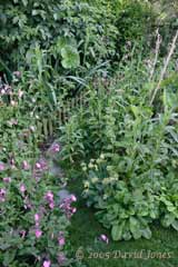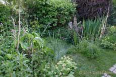 As you start to walk down the path you pass our original pond. This is one of those pre-formed plastic ponds, and is very small. While there are always frogs in it they do not spawn here. As the picture shows, it is now hidden by plants - I have decided to let it develop without interference from me for the next few years.