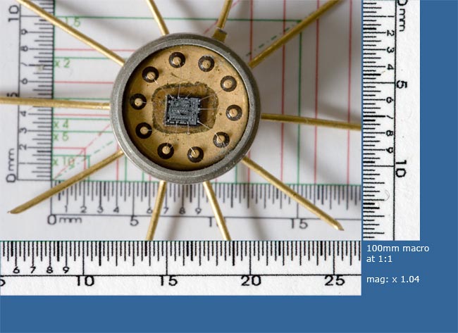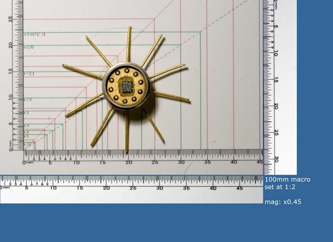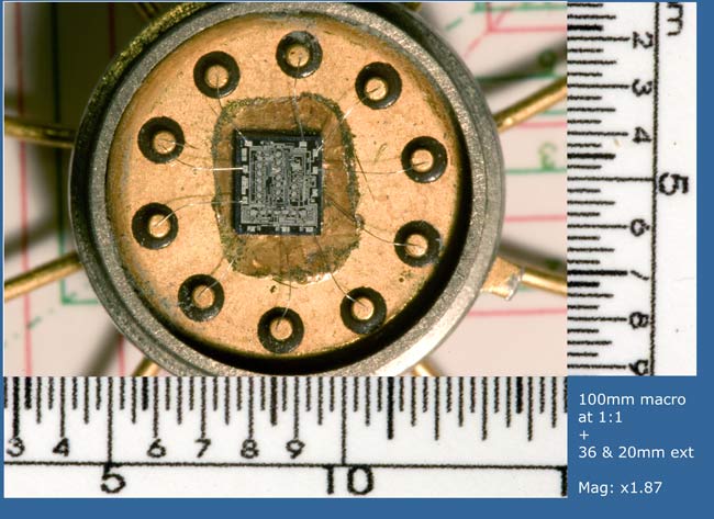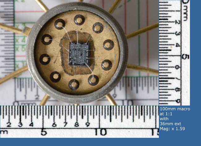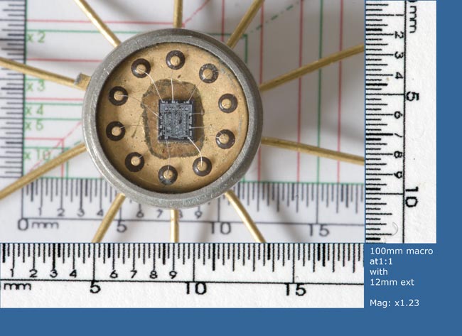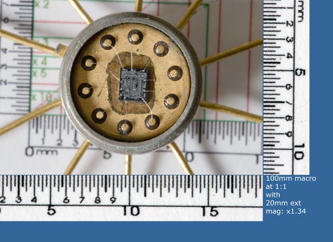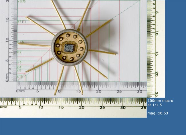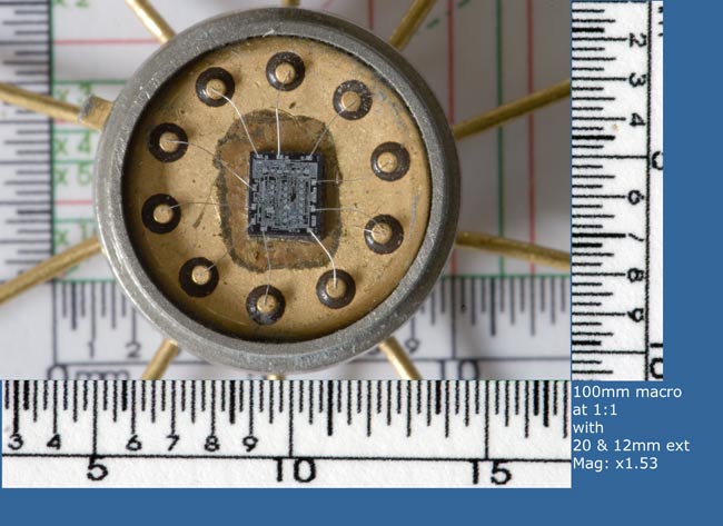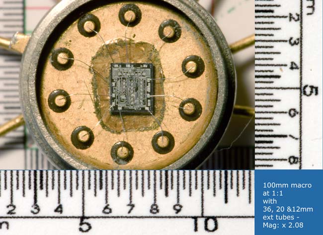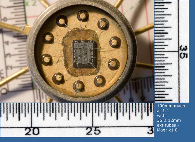 Images taken with the100mm macro lens & Kenko extension tubes In each case, the main image represents the full frame. The microchip is approximately 5mm above the card backround. The scales below and to the right are also cropped from full frames and were photographed at exactly the same camera settings as the main image. The magnification given in the bottom right-hand corner of each image is calculated from these scales.