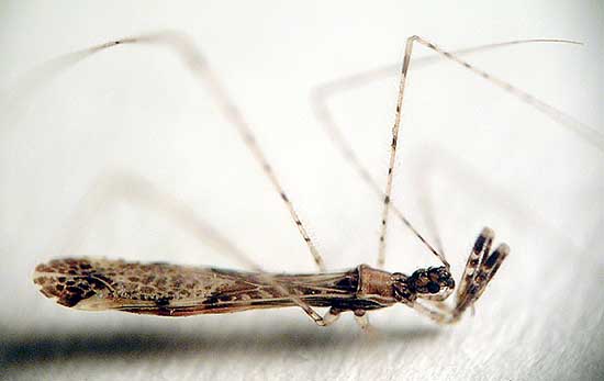This Assassin Bug (Empicoris vagabundus) has raptorial front legs and feeds on aphids and other small insects. It has very long, delicate legs and antennae. If you look carefully under its head you can see its very curved rostrum, or beak.