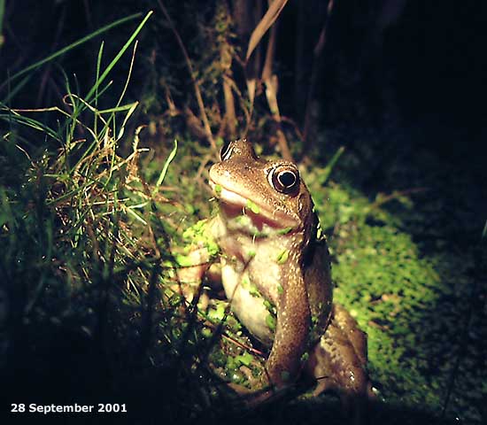 A frog in its typical night-time pose, stretching up to look (and listen?) over the bank at the side of the pond