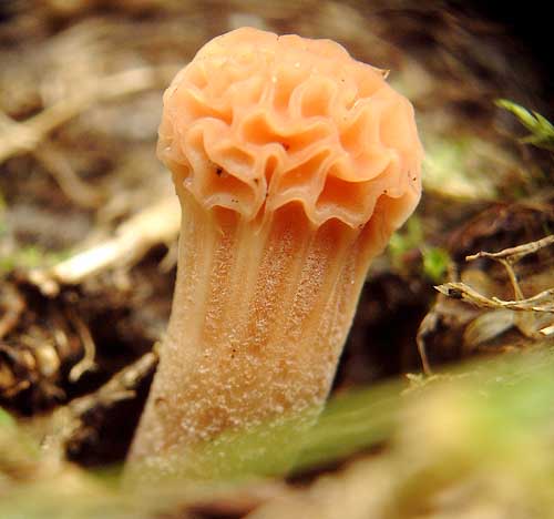 This fungus was spotted on 2 September 2001. It has grown out of a deep round hole (diameter 2cm) that had been made in the ground in a grass covered part of the garden. Down in the hole are some more, very small stalks, each with a small spherical 'head'. The top of the pictured fungus has a diameter of about 8mm. |