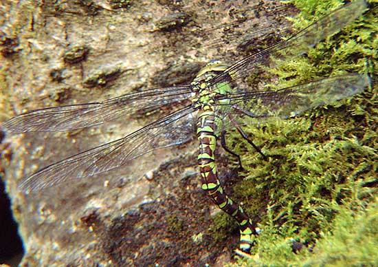 The picture shows a Southern Hawker dragonfly(Aeshna cyanea) laying eggs in damp moss on a log in my pond, between 30-35cm above the water. They will remain there through the winter in a state of suspended animation (diapause) before hatching in the early Spring. My Dragonfly guide says that among the prolarvae that hatch from these eggs the mortality rate may be high as they try to reach the water after hatching. I shall have to ensure that the moss is kept moist if we have a dry spell of weather in the weeks to come - and I wonder how well the eggs cope with frosts? |