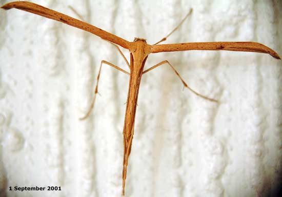 The picure shows a Common Plume Moth (Emmelina monodactyla) resting on the wall of my dining room where I found it hidden behind a picture frame today (1 September 2001). Plume moths have feather-like wings, and this one has a wing span af about 28mm. Its third pair of legs, and its antennae are held close to the body in this picture. A common moth in gardens and woodland, its caterpillar food plant is convolvulus. |