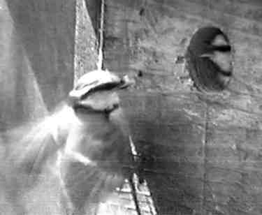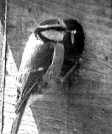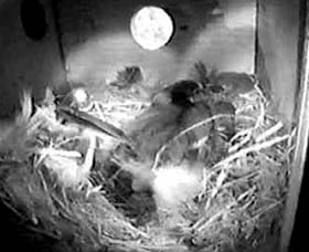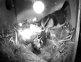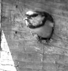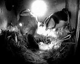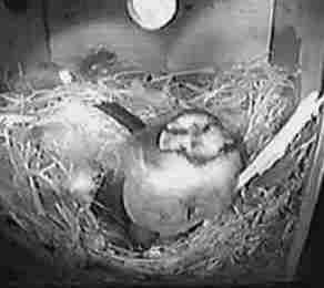 Egg Laying and Incubation - Up to 5 MayStraw started appearing in the box by the end of February and a bird was roosting in there. However, this has happened before so it was not until the end of March that the scale of activity really meant that nesting was a serious prospect. The first two weeks of April saw frantic activity with feathers being added more and more, despite periods of prolonged wet weather. This has been the third wettest April on record in the UK. I set up the camera links during this time and started recording the daytime activity, starting at 4am each day. The dawn chorus started just after 5am and before egg laying started the male could be heard calling from a nearby tree. On a number of ocassions, about 5.30-5.40am he would arrive at the box entrance and provide an early morning alarm call for the female inside. I should point out that all times are British Summer Time (1 hour ahead of GMT). This is a poor quality image of the moment when the first egg was laid at 6.25am on 13 April 2000. With a bit of imagination you can just see the egg below her right side.