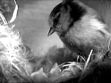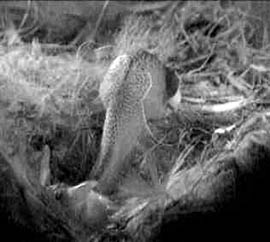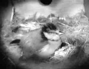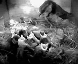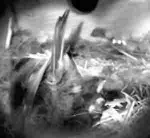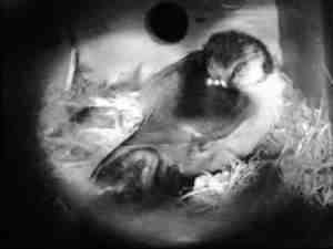 The Chicks Grow Up - The next six daysFriday 12 May. It is a week since the first chick hatched and a lot of eating and growing has gone on since then. The parents have been as busy as ever bringing food and the chicks are ready to gobble up anything they are offered. The female was awake by 5.10am. At 5.21am there was a muted call from outside. She quickly got herself up and left the box. Immediately the male entered with the first meal of the day. Between then and 9am the pair returned with food 125 times, and by the end of the day the female had brought 159 food items to the box and the male 230. To balance things out, the female frequently spent time doing nest maintainance. This inevitably involves her 'burrowing down into the cup, tail straight up with the heads of the chicks popping up around her. The female was back in the nest for the night at 7.50 tonight and then spent most of the nest 15 minutes busily working on the edges of the nest cup. At 11.10 pm she is asleep, perched on a narrow strip of nest with her feathers all fluffed up and her head down and against the south side of the box. She stayed like that for at least 15 minutes.
