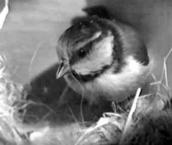 There was a healthy(?) population of white 'dots' that rushed around over the glass all night. I wonder if these co-inhabitants of the box are a source of irritation to the resting bird(s). By 4.10am The local blackbird had started his dawn chorus in the trees just above the box. The male blue tit could be heard by 4.25am. The restless sleep continued until 5.05am when she made a sudden exit as the male called from very near the box. The first food was brought by the male at 5.15am and he had made 10 visits by 5.30am At around mid-day some the chicks started to spread themselves around the box - they are no longer confined to the nest cup! It is, however, a case of crawling on 'all fours' . By the middle of the afternoon all but one had returned to the cup. The one that has stayed in the front corner of the box was ignored by the parents for a couple hours until it was fed twice in quick succession at 6pm. It rejoined the rest by 7pm. Feeding continued until 8.35 when the female returned for the night.