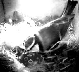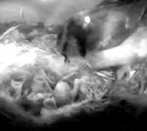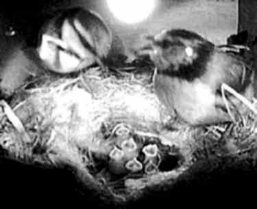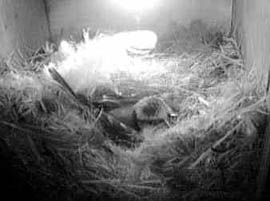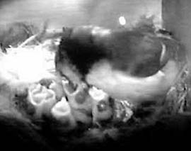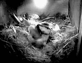 The female finally entered the box for the night at 8.15. However, at 10.30pm she was still very much awake. She frequently got up off the chicks and stood at the side of the box for several minutes at a time. It was not until after 11.30pm that she seemed to get more settled and get her head under her wing for the first time. Wednesday 10 May. This morning the female was awake by 5.15am and joined at 5.20am by the male bringing in the first food of the day. No time was being wasted on a bright, dry morning. I am thinking about how much the chicks have grown since last weekend, and they are noticably more downy now, and they are increasingly vocal. It is little wonder considering the amount of food provided for them. By the time the female stopped for the night at 7.55pm the pair had brought food to the box 319 times - mum 148 and dad 171. The male was very active in the late afternoon. The weather had by now become cloudy and decidedly damp with a high of 19C. The feeding through the day seemed to show a vague pattern of 'work sharing' between the parents so that for periods of varying lengths one parent would do the bulk of the feeding. For example, in one half hour period in the morning the female brought food 9 times to the males 2 times. In the afternoon a similar period saw the male feed the chicks 9 times while the female did not appear in the box at all.