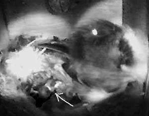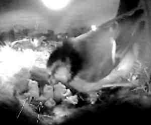 In the evening, when feeding was over, she did this for quite a long time, fluffed up and head tucked under wing as this image shows ( You can see the circles of light produced by the Infra-red LED's) Two of the chicks (arrowed) appear to look on hopefully, although at this stage they are still blind.