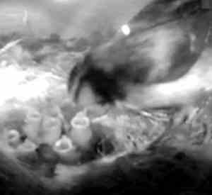 Sunday 7 May was another very warm day ( max 27C), if somewhat less sunny. We have been able to see at least 6 chicks at least once today. During the afternoon the female seemed to be quite uncomfortable at times and spent time standing n the corners of the nest, beak open as if she was panting to cool down. Feeding has kept both parents busy and they have been bringing in an assortment of food for the chicks. from mealworms to what appeared to be a thin legged spider or harvestman. When the parent enters the nest the chicks do not normally appear until the adult gives what sounds like a rapid series of clicks. Then the heads pop up in a very random way, necks stretched and mouths wide open. They are very unsteady at this stage and are prone to falling over like skittles! The parent does not put all the food into one open mouth, but seems to share it out . It has been interesting to see the parents apparently cooperating to break down larger food such as a meal worm into smaller pieces before offering it to the chicks. . Monday 8 May started damp but the sun came out
