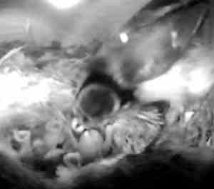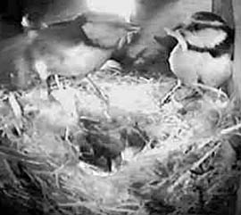 night. Tuesday 9 May was a humid day (max 24C), cloudy with some sunshine in the afternoon followed by a short period of heavy rain. Eight chicks is still the confirmed total so far. Feeding continued all day from 5.36, with the male appearing with food within a couple of minutes. On of the first things the female did was to take out of the box the largest piece of eggshell left from last night. I counted the number of feeds by each parent over a 6 hour period starting at 1pm. The female brought food 58 times and the male 64 times. The rain just after 5pm disrupted things somewhat. The female spent nearly 20 minutes in the box, sitting on the chicks for most of the time and doing a bit of preening. As soon as the rain eased the male, who looked soaked, went into overdrive and in the next 45 minutes he arrived at the box with food 20 times. In the same period the female made 10 trips. On a number of occasions, if parents were in the box at the same time, the food was passed from one to the other before being offered to the chicks. Inevitably now the parent seems to try each mouth for size or eagerness as the food is offered. Often, after the food has been eaten, one of the chicks then presents its rear end and voids its white,encapsulated droppings which the parent either eats or takes out of the nest. In the following sequence the male feeds a chick with a mealworm. The same chick then does a headstand. The male waits until the 'package' is presented. He then takes it and leaves the box.